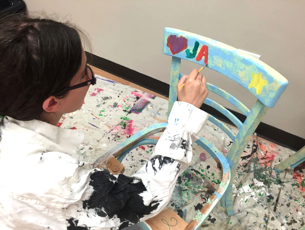 The Warriors have been been busy working on several chairs from the Life Shop! Jackie, Charlie and Patrick began week #1 by sanding,using both electric and hand sanders. Week #2, they primed the chairs and got them ready to paint. Once this was done, the chairs were ready to be sponged painted! Week #3 they selected the paint colors and sponged painted the chairs creating different patterns. Because Jackie’s original chair had been damaged, She was given the chance to personalize another chair with her name, flowers, stars, and even a crown!