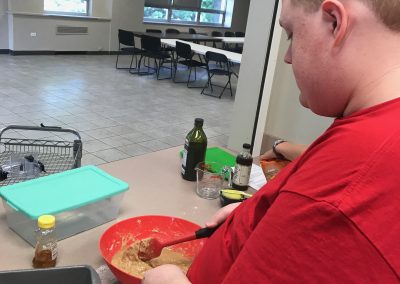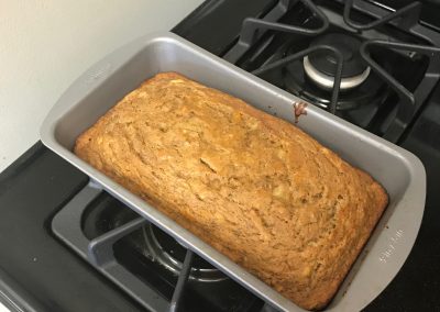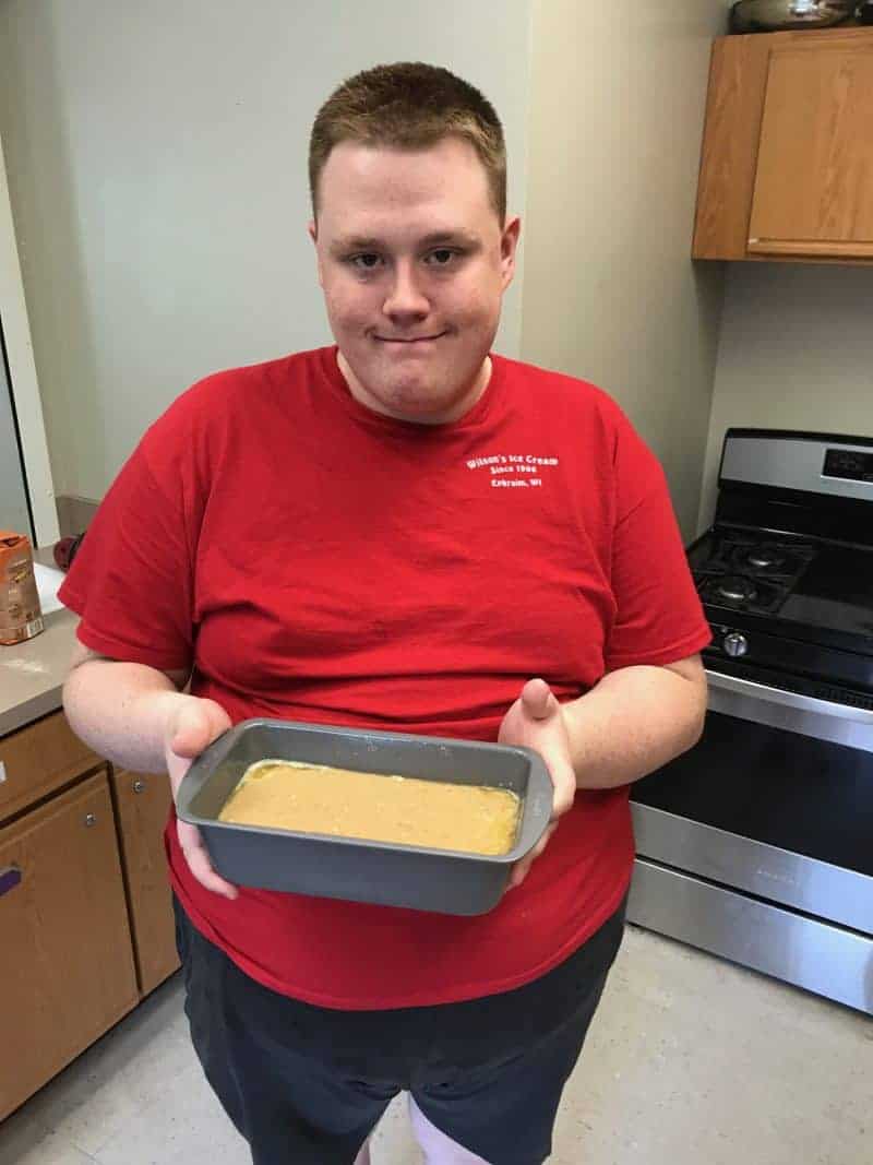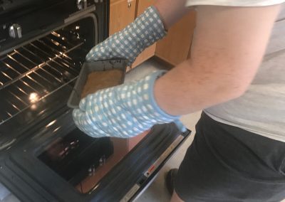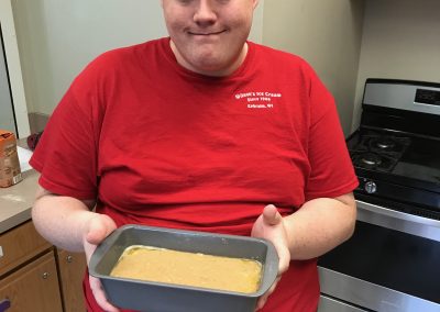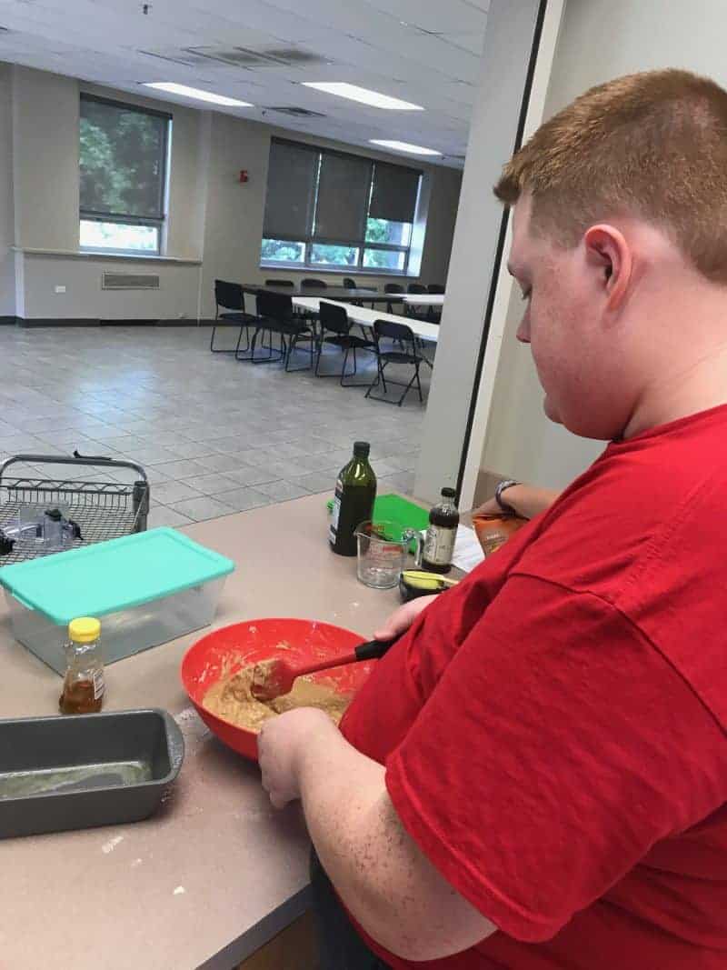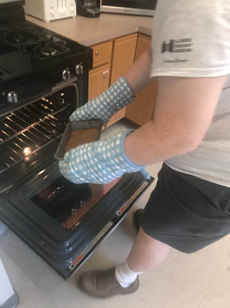 Life Shop Warriors complete a cooking pre- survey that asks them to select the kitchen skills they would like to work on during cooking when at the Life Shop. Â The survey asks them to either provide their desired skill or select skills from the list that includes cooking with a knife, food processor, microwave, stove, or oven. They were free to choose one skill or multiple skills. Â Then they will be scheduled to receive individualized cooking classes with Life Coach & Culinary Director Joe for a period of five weeks. Â Each day they cook, Life Coach Joe will work with the Warriors to select recipes that focus on using the skills specified on their pre-survey. Â After they cook a meal the Warrior is asked to fill out a daily reflection that measures how they thought the day went and if they felt that progress was being made towards their personal goal. Â Warrior Max was our first to participate in this MyWP cooking program. Â One of the skills he selected was cooking with an oven. Â During the first few weeks Max asked Joe to put to place and remove food from the oven, he did not feel comfortable doing this on his own. Â However, during the last week Max not only cooked his very own banana bread independently, but he also removed it from the oven after it was finished cooking! Â We couldn’t be prouder of Max. Â Check out the quick video of Max removing his banana bread from the oven.