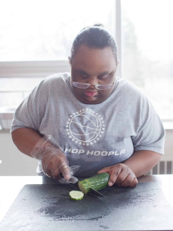Katrina Jeffries is a student at the OPRF CITE program and has been a Warrior at Opportunity Knocks for three years. Katrina is a recent addition to our pickling team. She currently works in the Rush Hospital kitchen in addition to working for Knockout Pickles. Katrina’s favorite part about being on the pickle team is demonstrating her pickle slicing skills. Katrina is also a member of our Warrior Catering team where she hones her kitchen skills. Katrina is a vital member of the team who specializes in making buckets of pickles for our restaurant customers.Top Skills